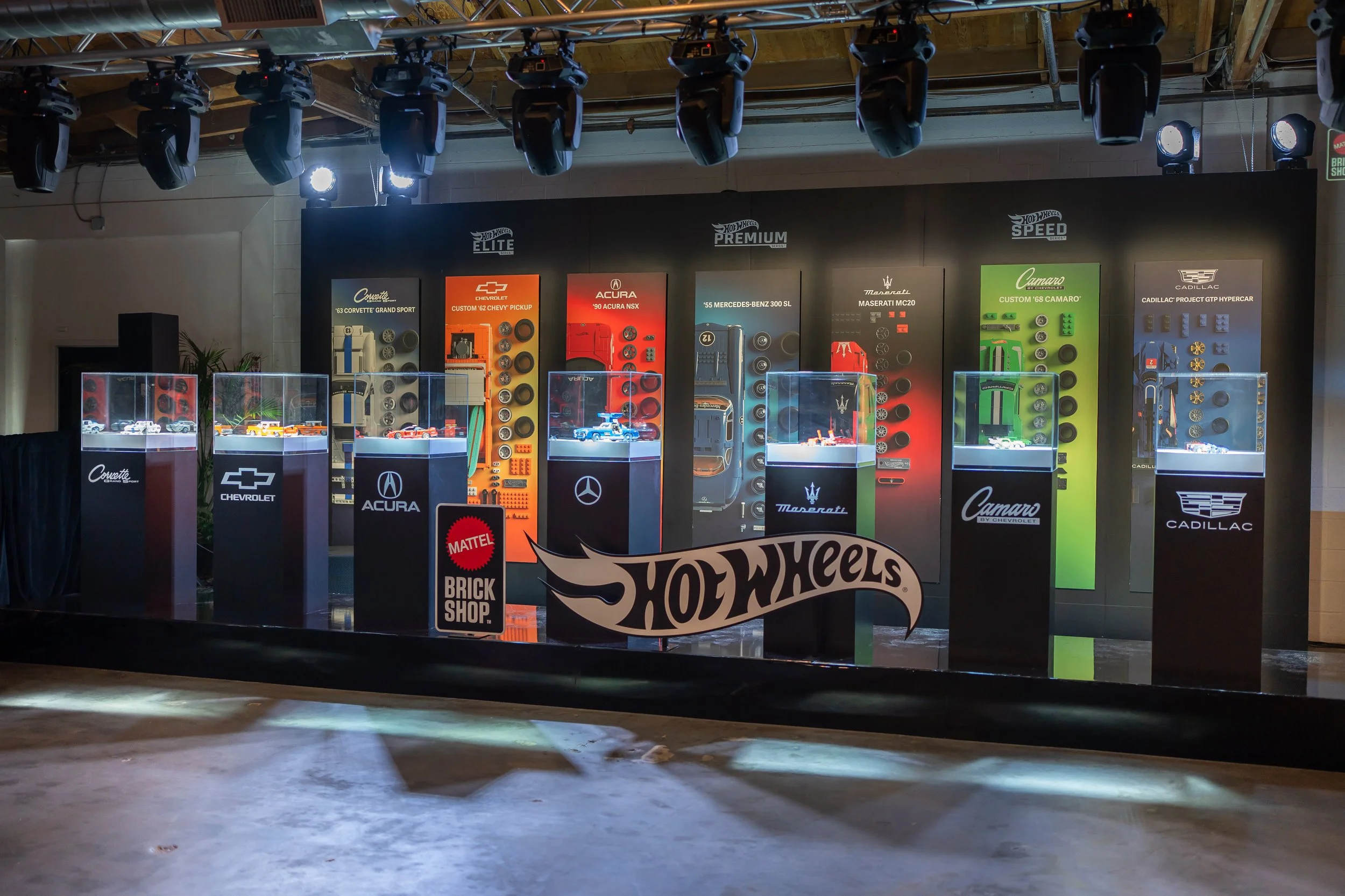 Inside the venue, the experience was engineered for social sharing and hands-on interaction. Soft lighting panels, mounted cameras, and phone stands enabled effortless content capture at custom build stations. Community-build tables encouraged collaborative model-making, while custom-build stations introduced seven new licensed OEM car models from the collection. Additional features included Speed Build Challenge, a branded step-and-repeat anchored by an 8-foot-long, 50-pound Hot Wheels logo, and eye-catching luxury cars like a Maserati and Acura NSX stationed outside for photo ops. The event set the tone for Mattel’s expansion into building sets, offering a high-design, tactile experience that celebrated innovation, play, and automotive culture.