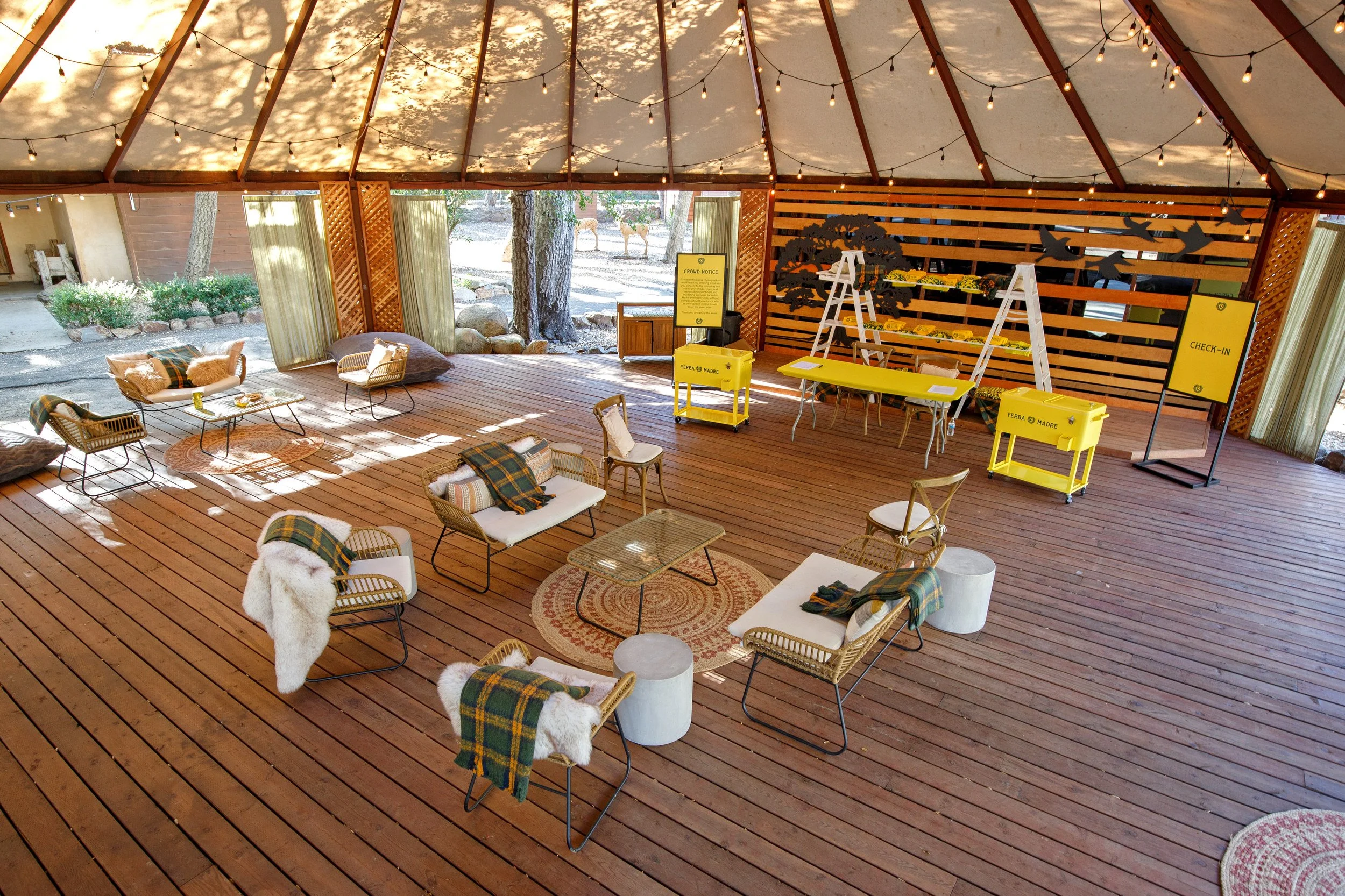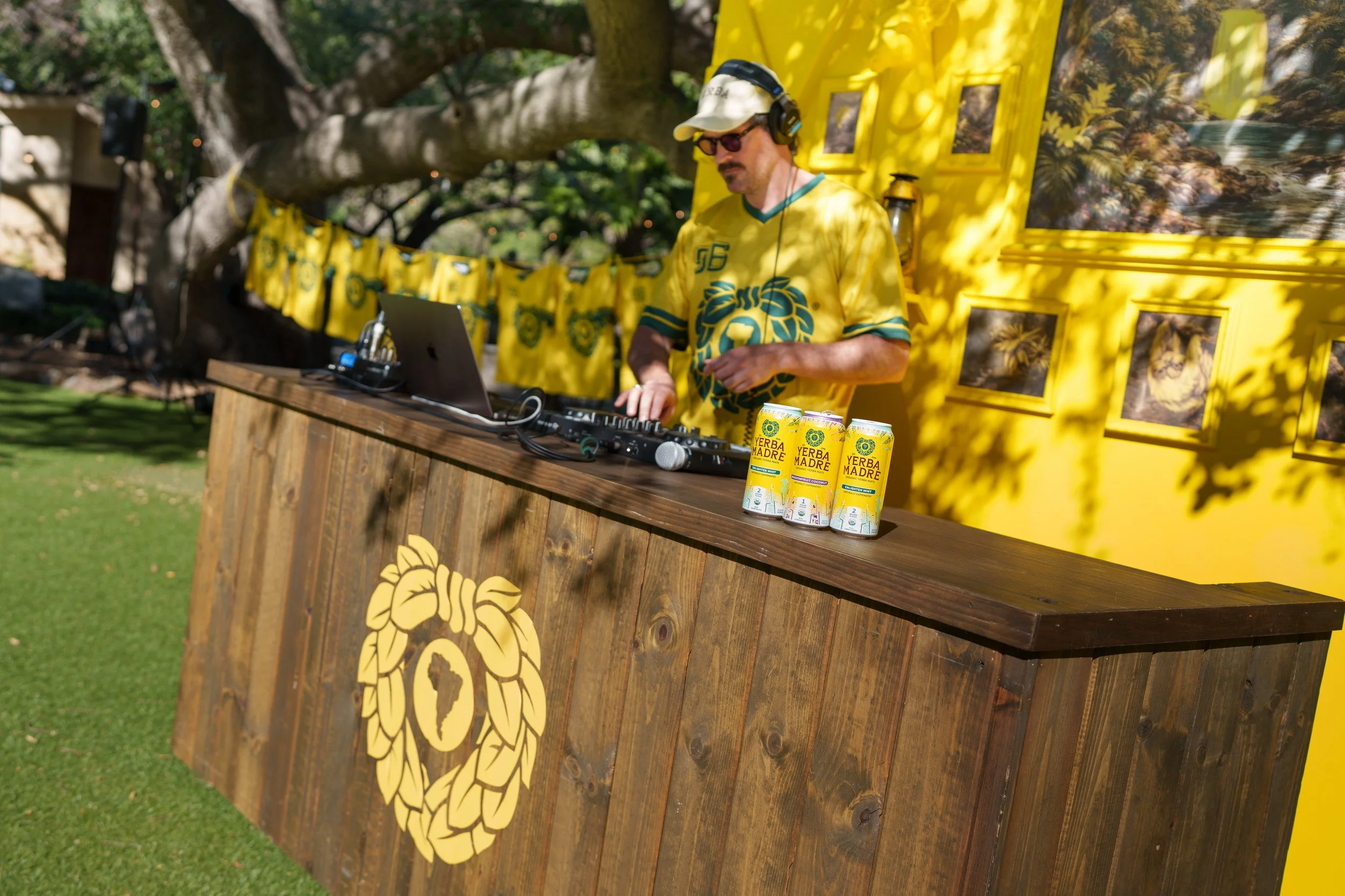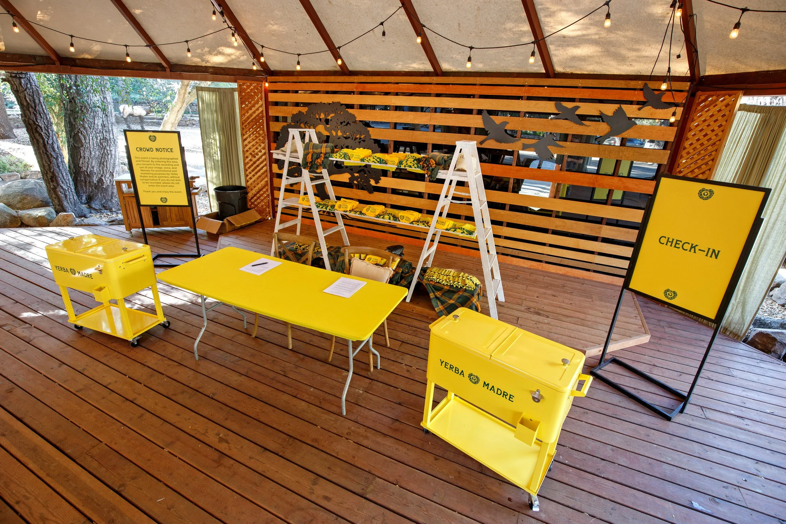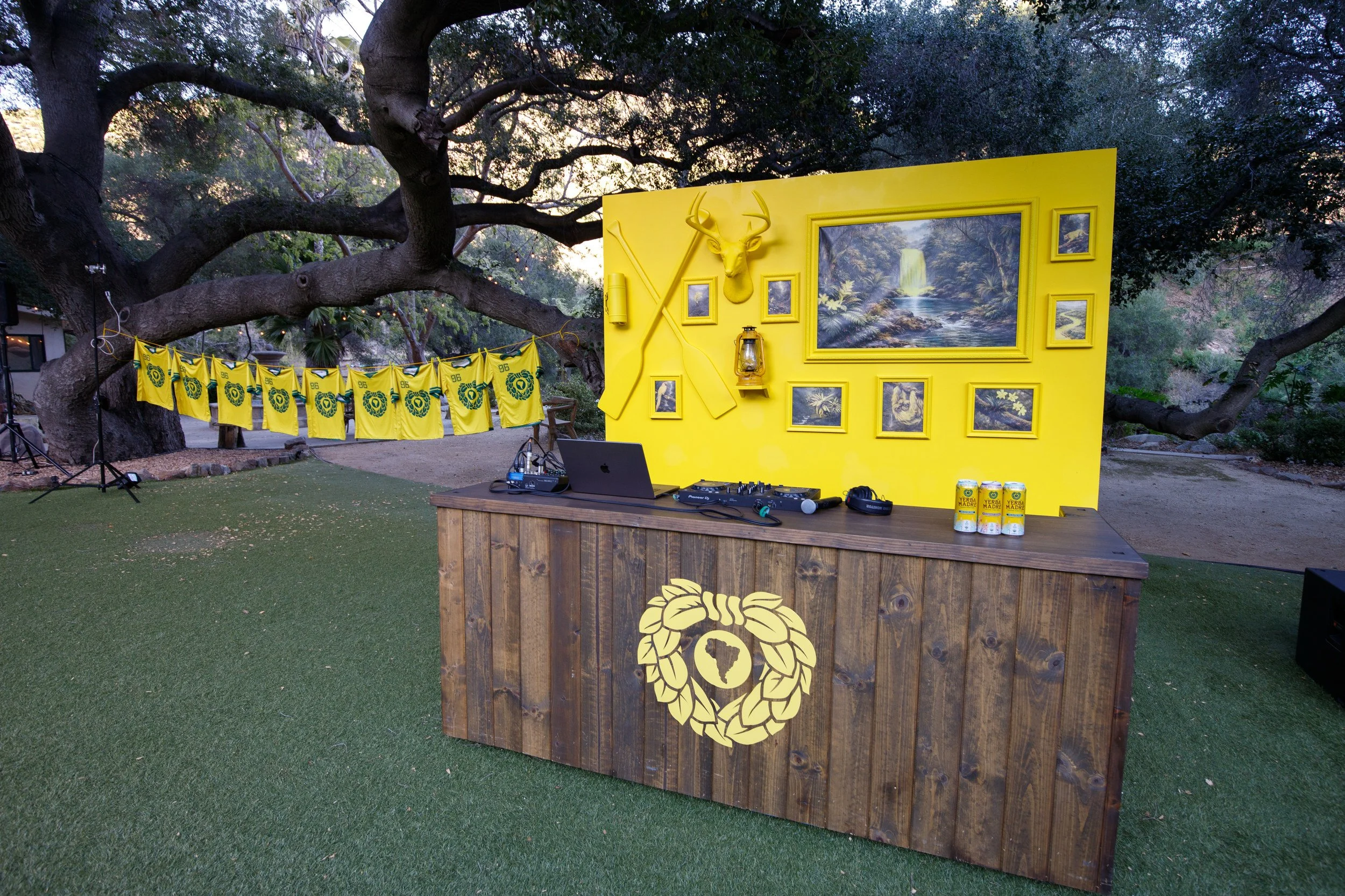 Stoelt fabricated custom directional signage, installed a yellow gallery wall of nature-inspired artwork behind the DJ booth, integrated a 10-foot inflatable Yerba Madre can, and layered in eclectic camping props—from vintage lanterns to life-sized faux moose and bear—to add depth across the space.