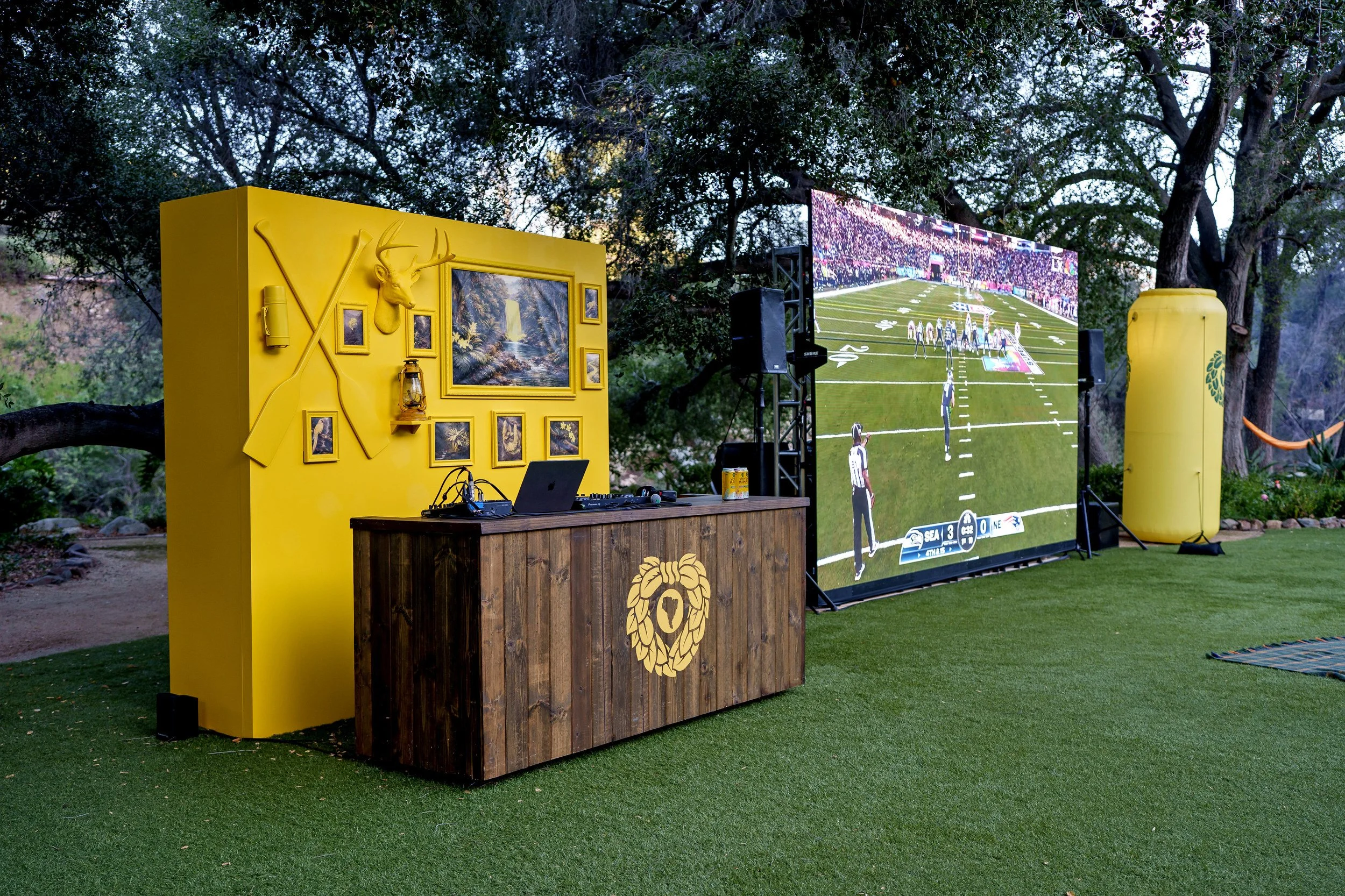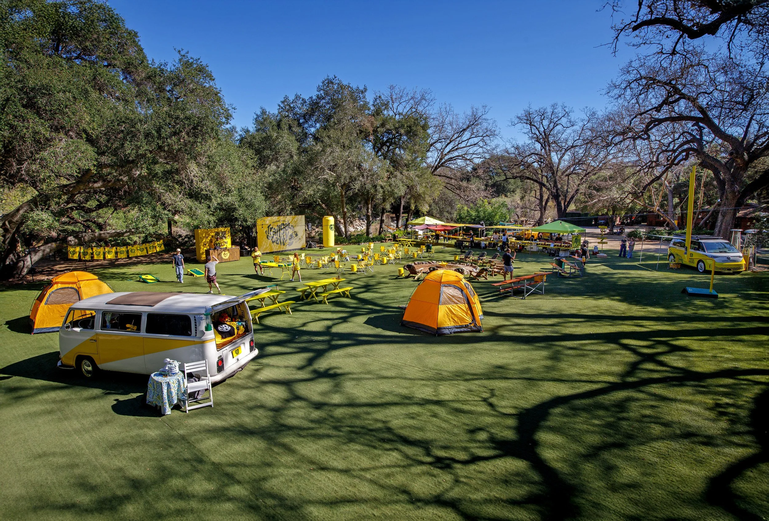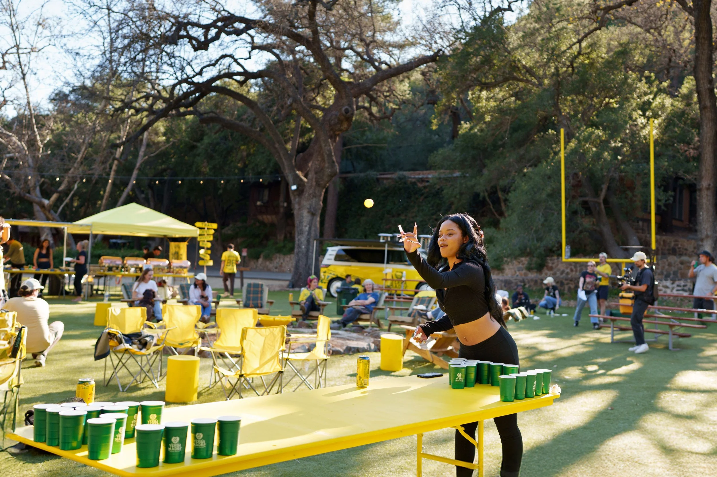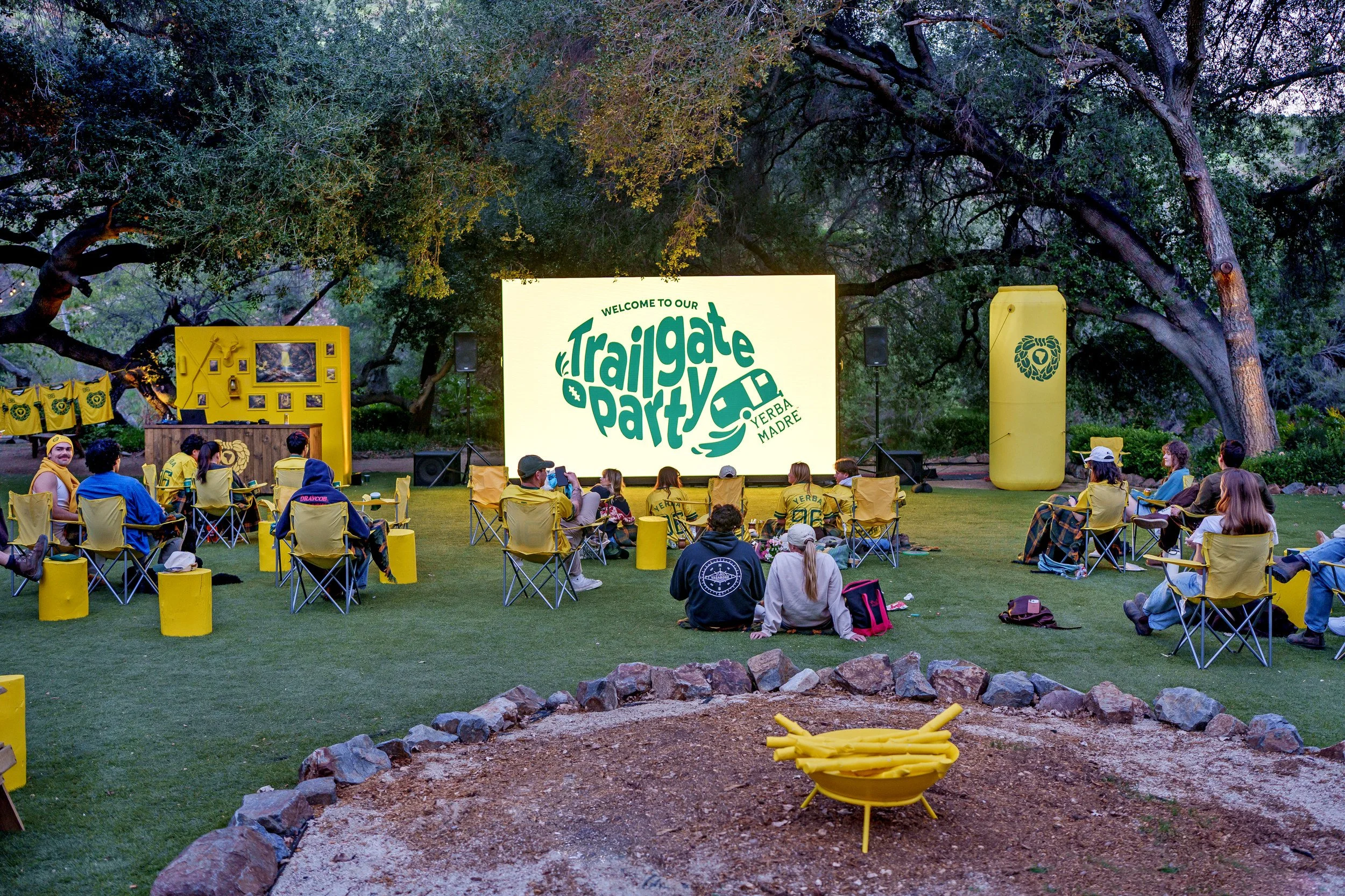 The expansive outdoor setting was reimagined in bold Yerba yellow, blending football culture with campsite nostalgia. Custom-fabricated yellow football uprights stood tall within the footprint, along with a 16’ x 9’ LED wall for Super Bowl viewing, and yellow tree stumps, picnic tables, Adirondack chairs, and branded coolers created natural gathering zones across the property.