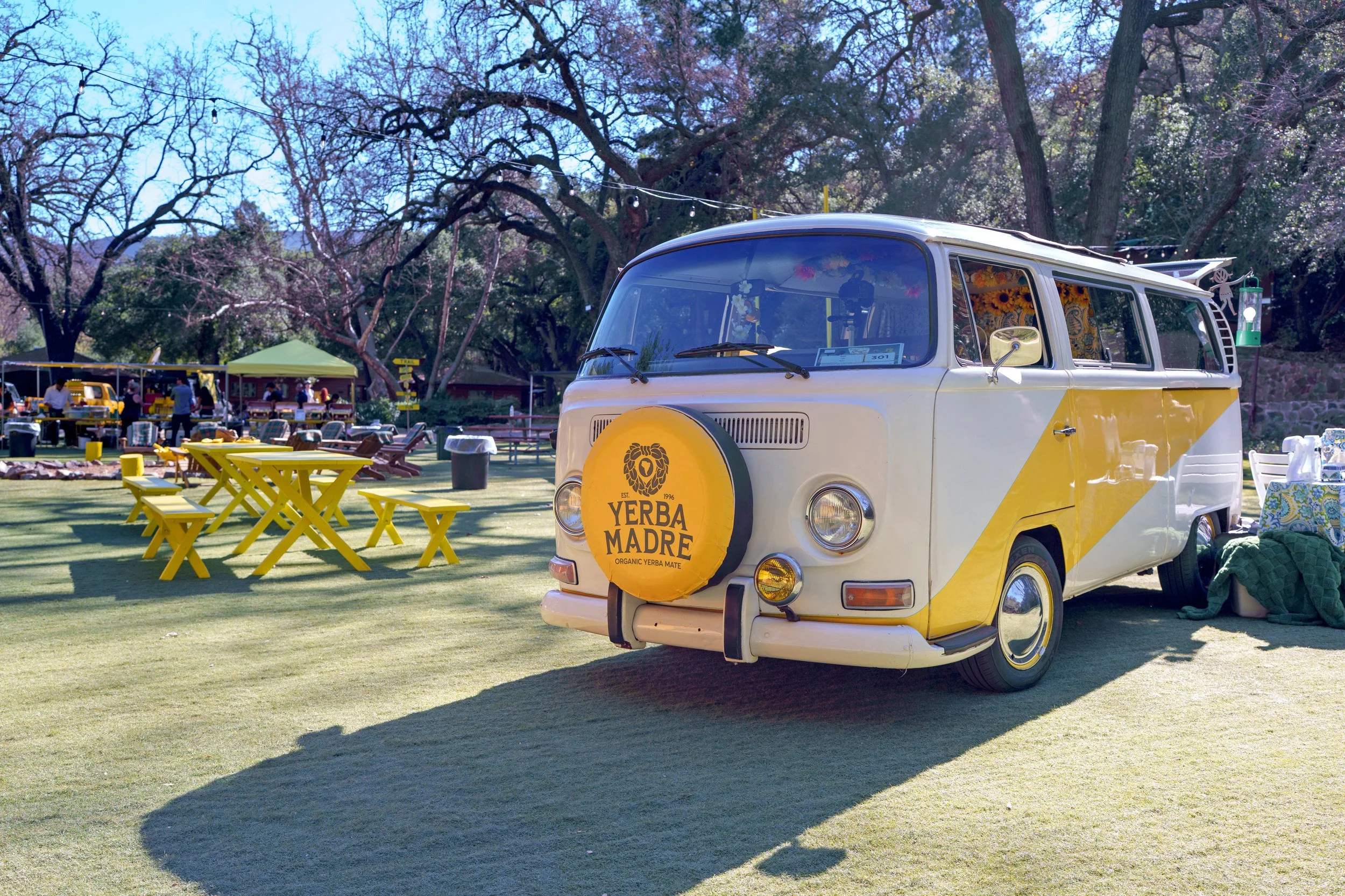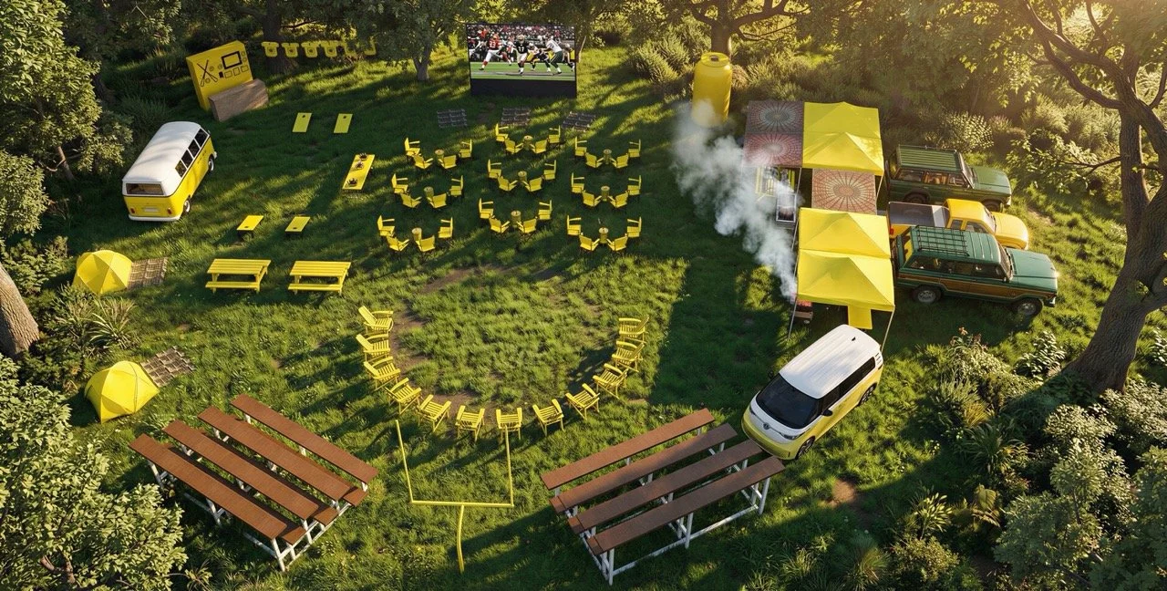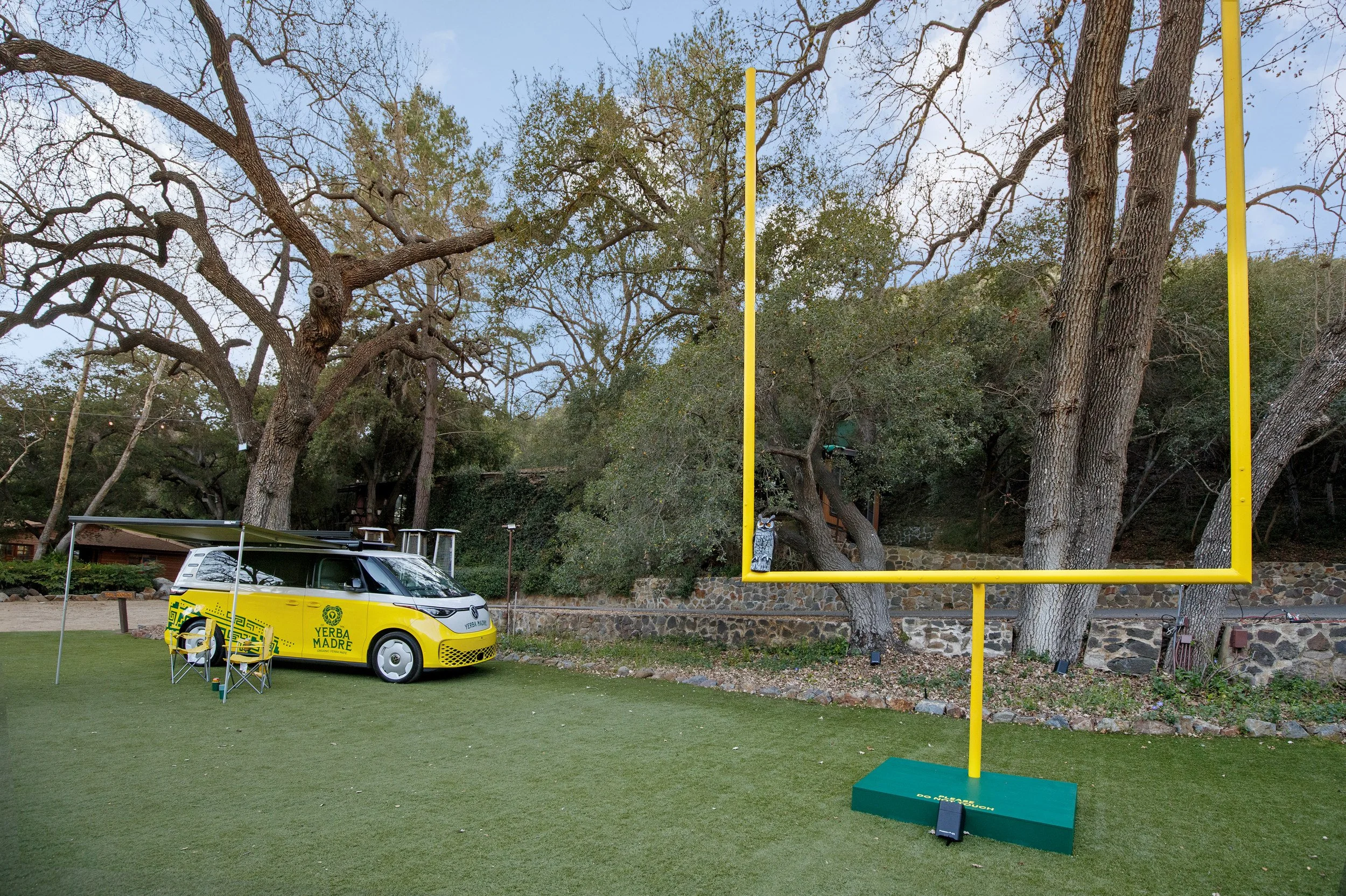The expansive outdoor setting was reimagined in bold Yerba yellow, blending football culture with campsite nostalgia. Custom-fabricated yellow football uprights stood tall within the footprint, along with a 16’ x 9’ LED wall for Super Bowl viewing, and yellow tree stumps, picnic tables, Adirondack chairs, and branded coolers created natural gathering zones across the property.