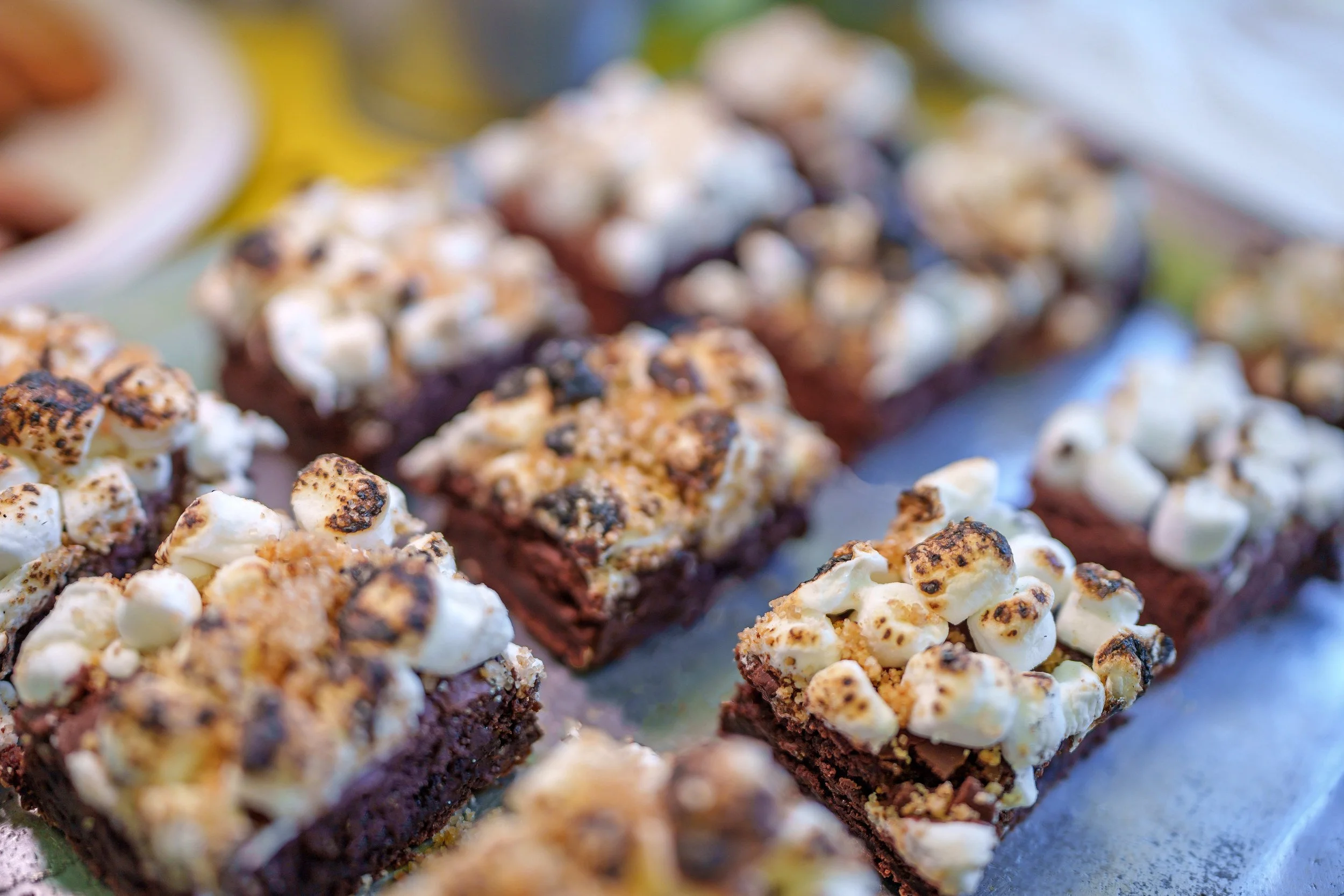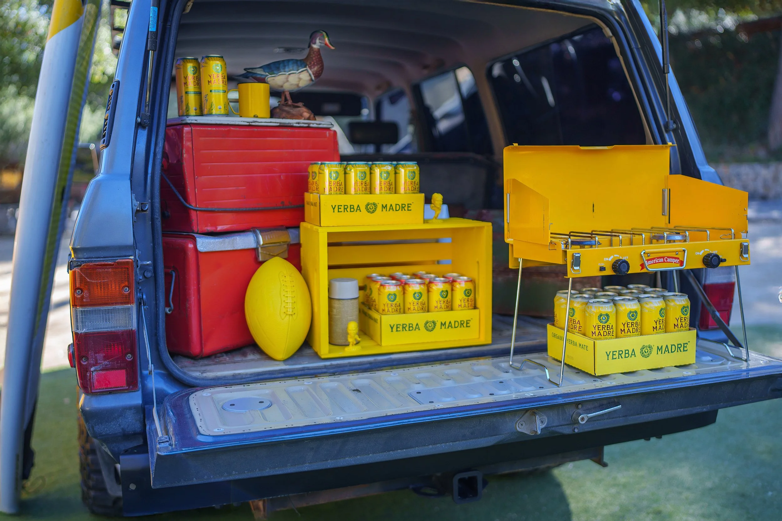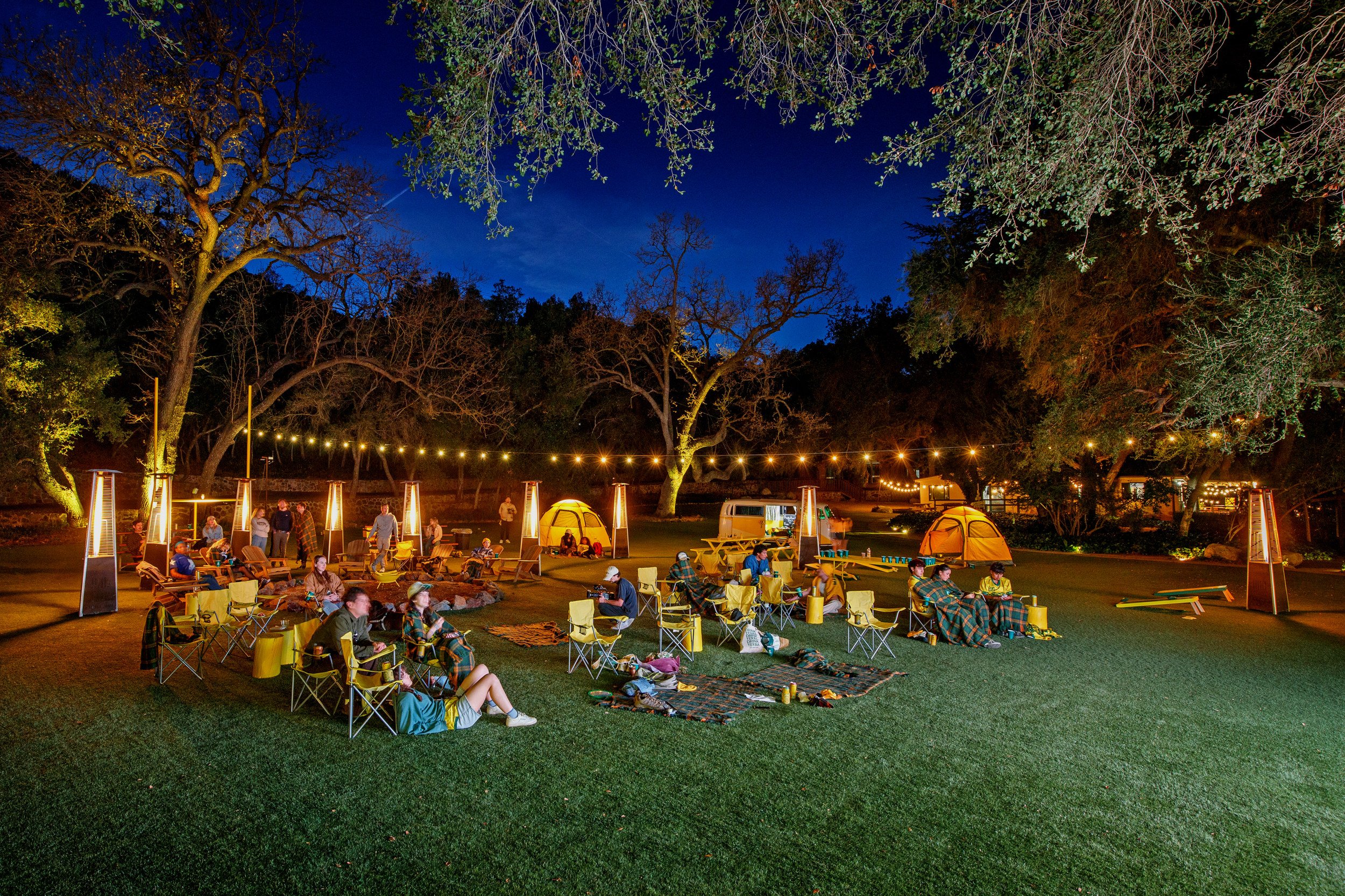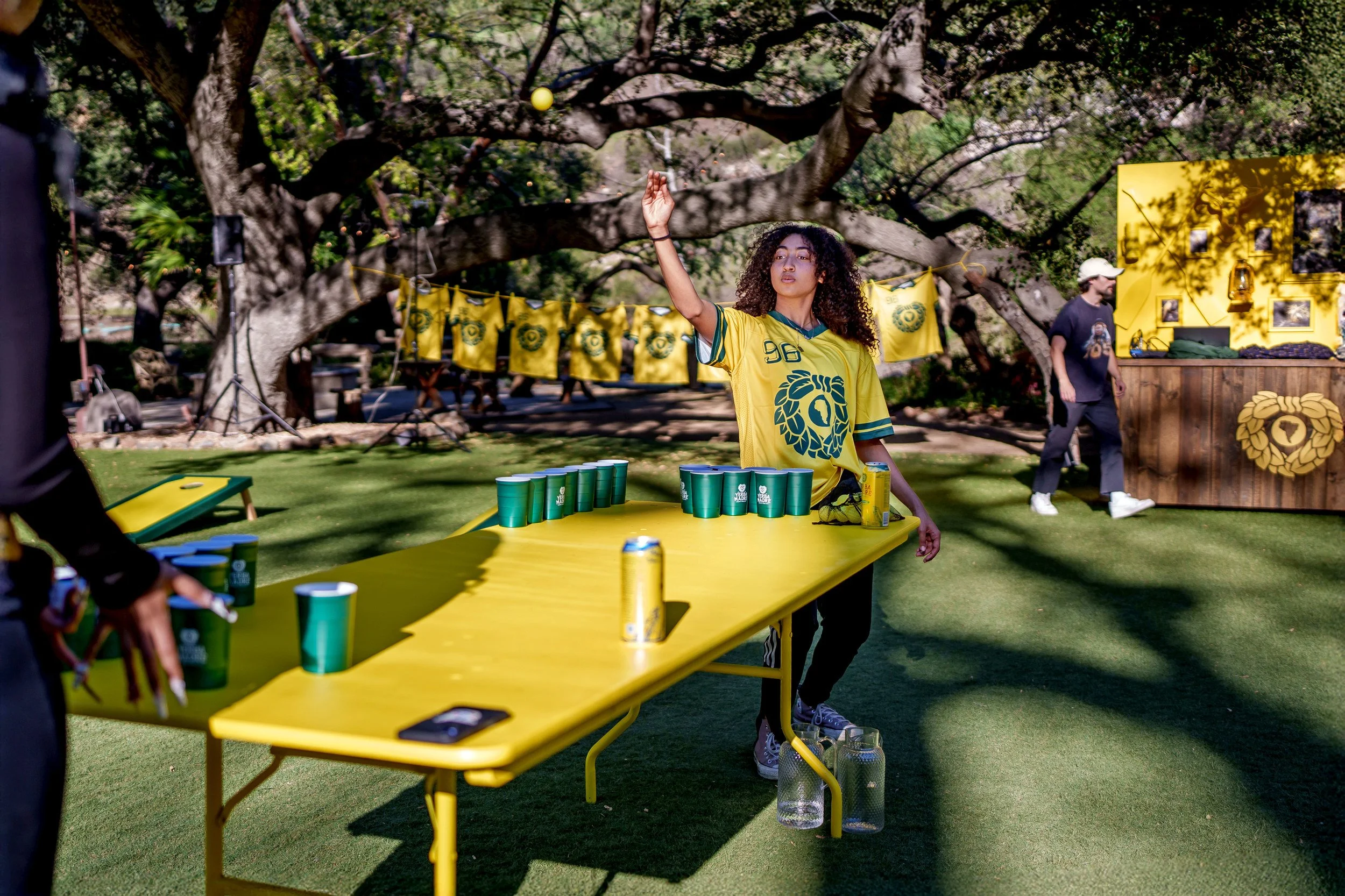 The expansive outdoor setting was reimagined in bold Yerba yellow, blending football culture with campsite nostalgia. Custom-fabricated yellow football uprights stood tall within the footprint, along with a 16’ x 9’ LED wall for Super Bowl viewing, and yellow tree stumps, picnic tables, Adirondack chairs, and branded coolers created natural gathering zones across the property.