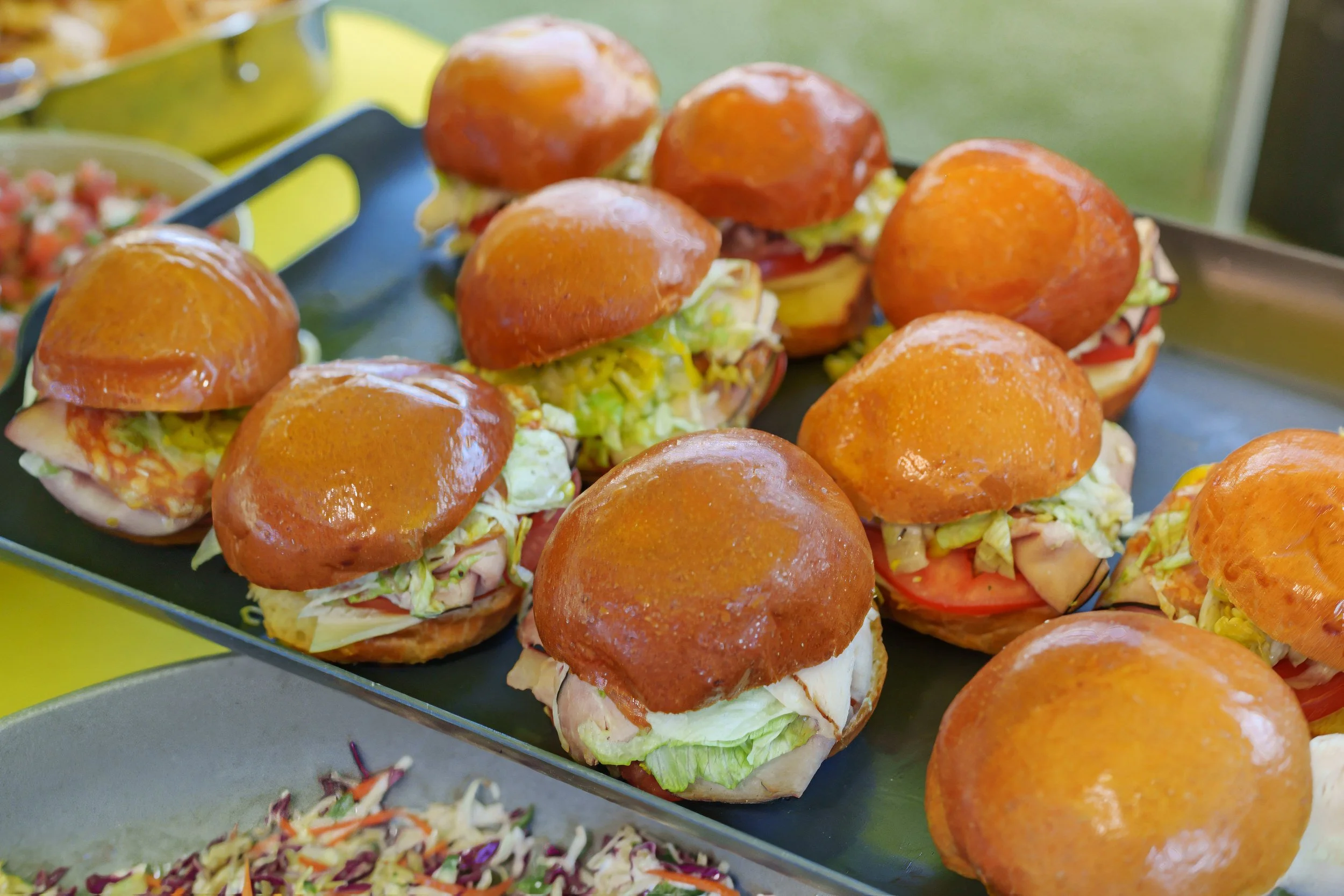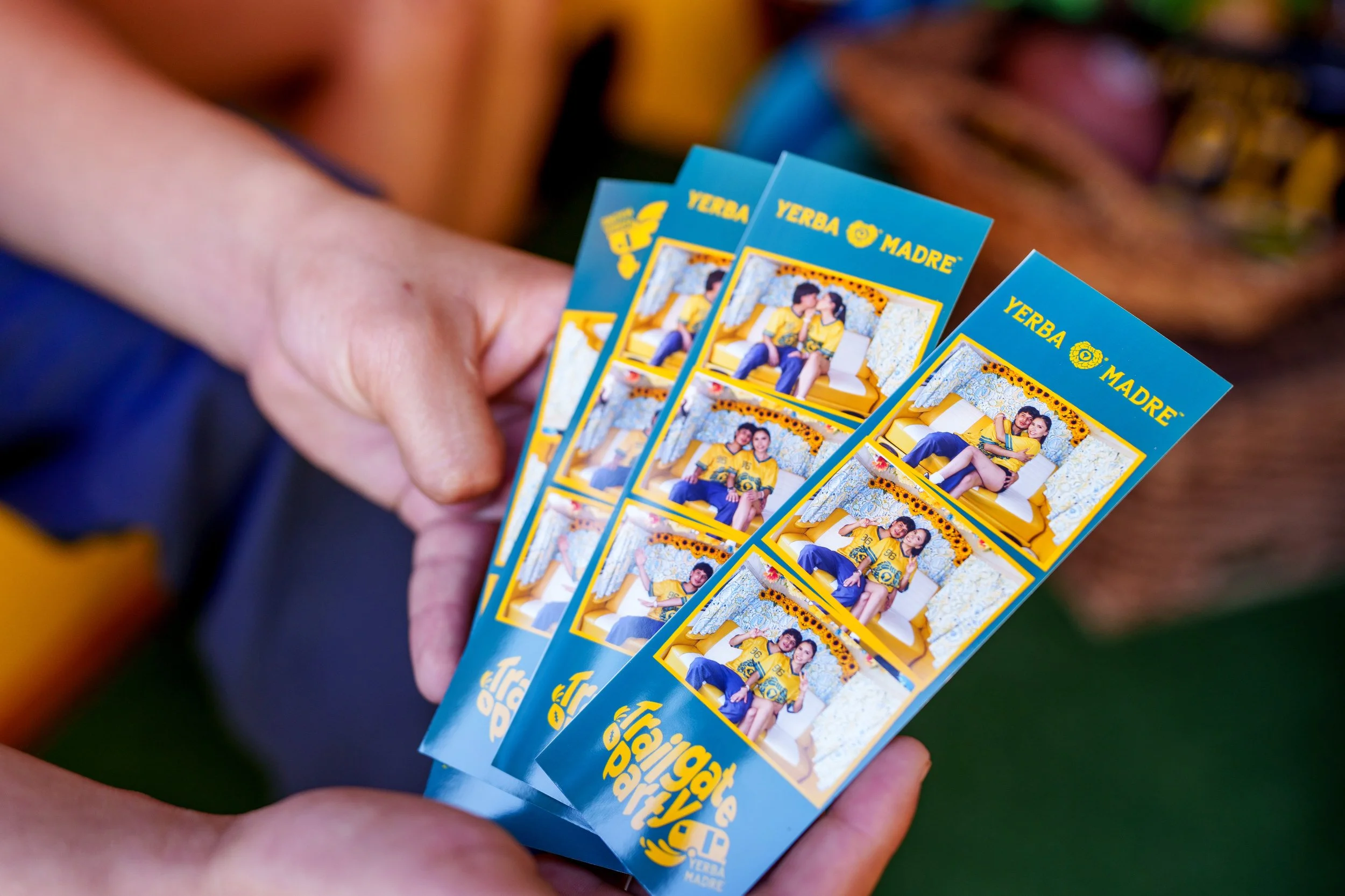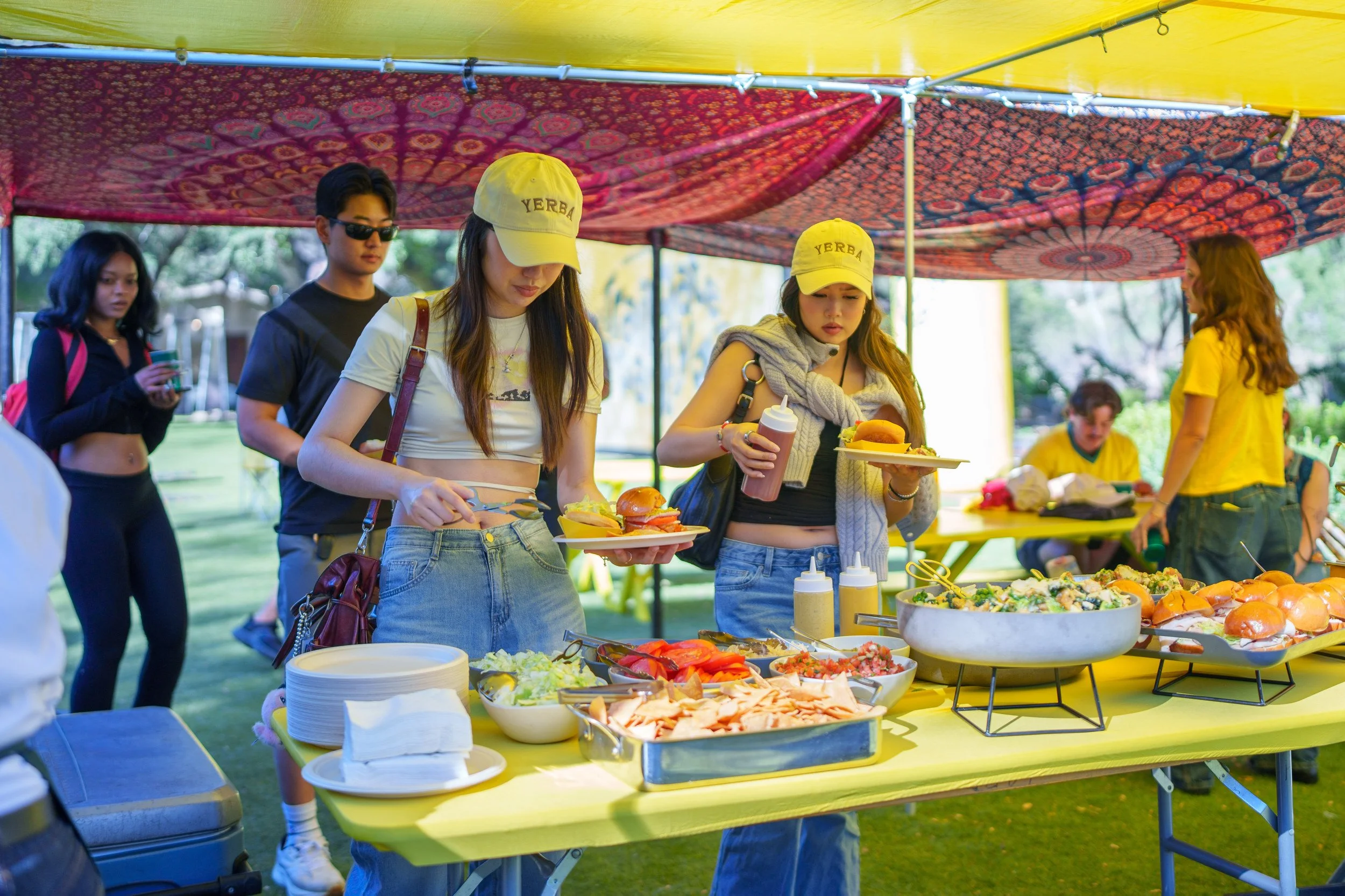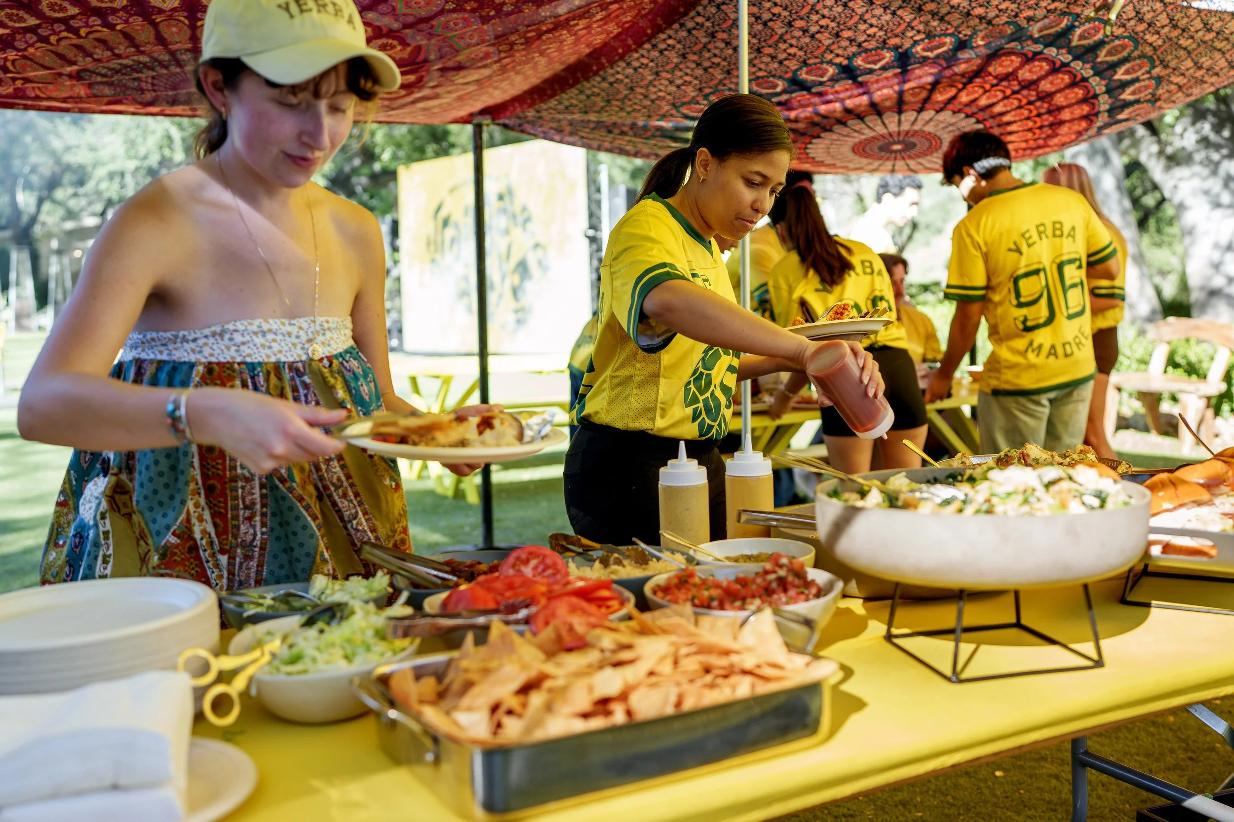 Grilled brats, hot dogs, and cheeseburgers were cooked live beside the vintage yellow and green studio prop vehicles, reinforcing a true tailgate atmosphere, while the bar served Yerba Madre mocktails throughout the day.