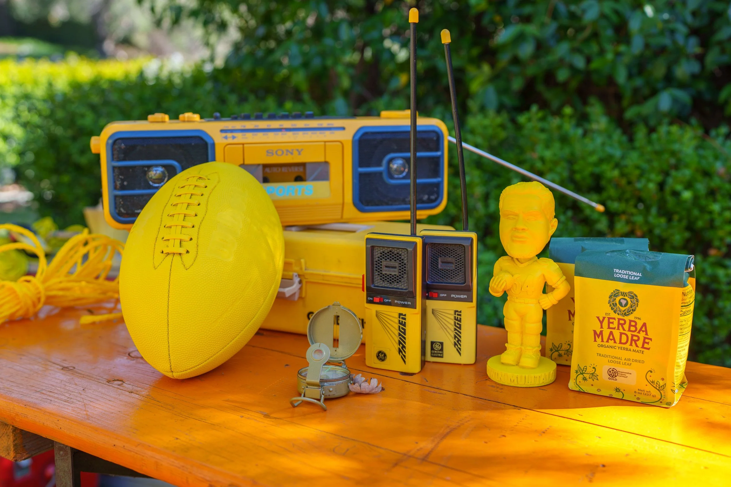 Several sourced vintage elements were painted to match the same saturated yellow tone, creating a cohesive monochromatic visual look throughout the build.